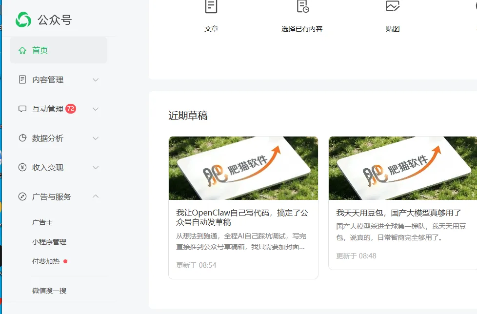 本来写好文案,每次都要打开公众号后台,复制粘贴,格式调半天,挺烦的。刚好手里有OpenClaw,就想着,能不能让它直接帮我把写好的文章推到草稿箱?我只需要加个封面点发布就行。