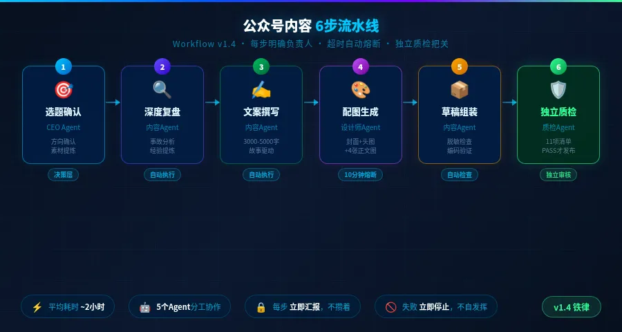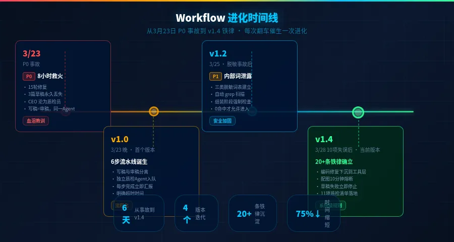 v1.4 的完整 Workflow 沉淀了 20+条铁律,11项质检清单,3类脱敏词表。从 v1.0 到 v1.4,每一条规则背后都有一次真实的翻车。