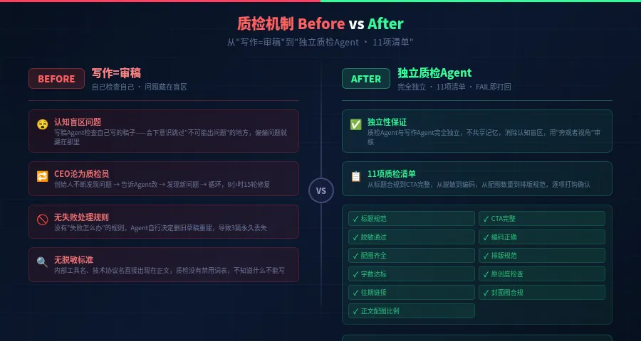 质检 Agent(独立层):完全独立于写作 Agent,执行 11 项检查清单。任何一项 FAIL,打回修改,重新质检。PASS 后才能推草稿箱。