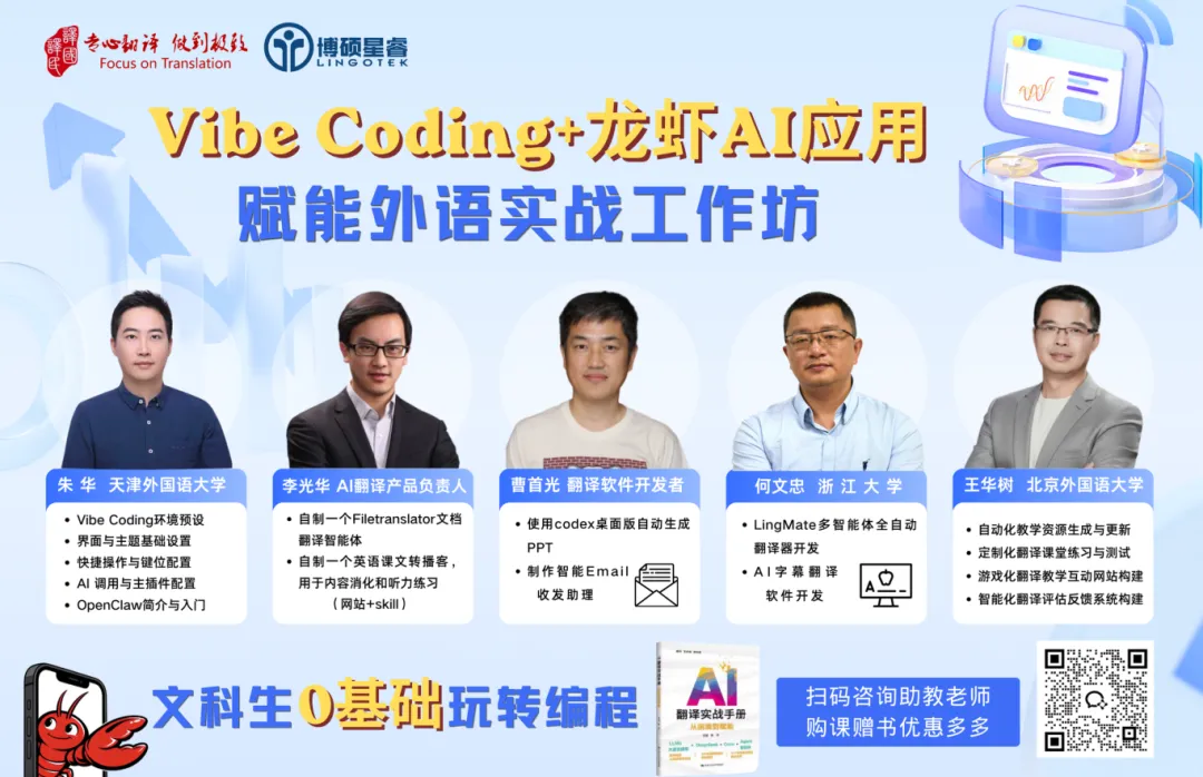 我们近期联合推出了 「文科生0基础玩转编程:Vibe Coding + 龙虾AI应用赋能外语实战工作坊」,五节课程紧扣外语真实场景,从环境配置到智能体开发,从文档翻译工具到多Agent翻译系统,从教学资源自动生成到游戏化翻译教学平台搭建,覆盖了从入门到实战的完整路径。课程不要求任何编程基础,所有开发均以自然语言驱动完成。
