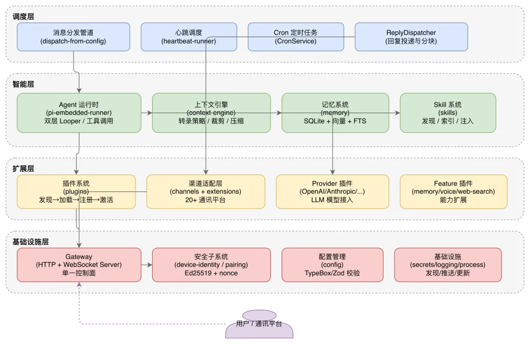 这四层之间构成了一条清晰的数据生命线:用户消息从通讯平台进入渠道适配层,经 Gateway 路由到消息分发管道,分发管道交给 Agent 运行时处理,Agent 在上下文引擎和记忆系统的支撑下完成推理,最终通过 ReplyDispatcher 将回复投递回用户。