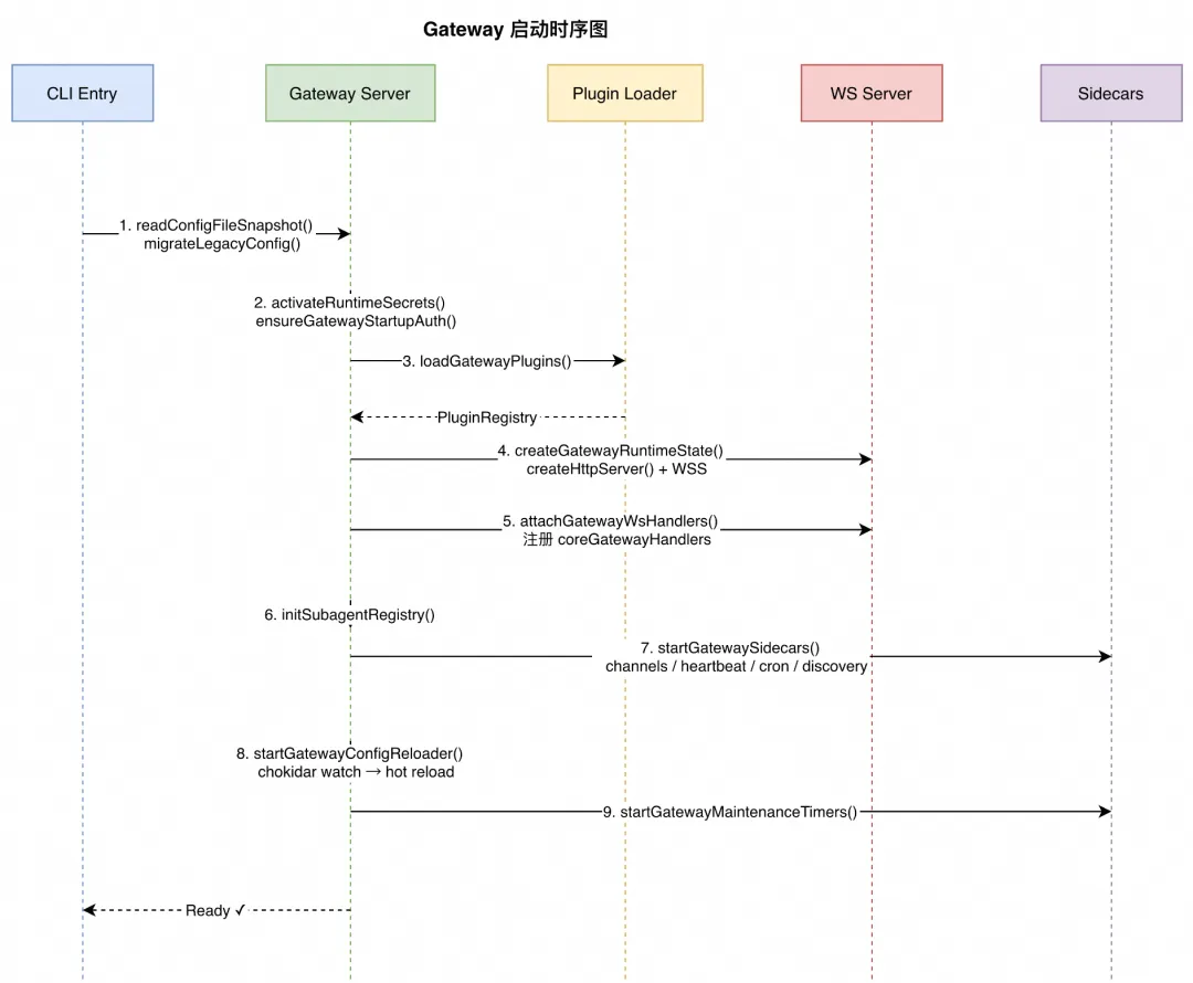 启动序列中值得注意的是第 3 步和第 5 步的关系。插件加载必须在 WebSocket handler 注册之前完成,因为 loadGatewayPlugins 返回的 PluginRegistry 包含了插件注册的 gateway method handler,这些会被合并到 coreGatewayHandlers 中。如果顺序颠倒,插件注册的 RPC 方法将无法被客户端调用。