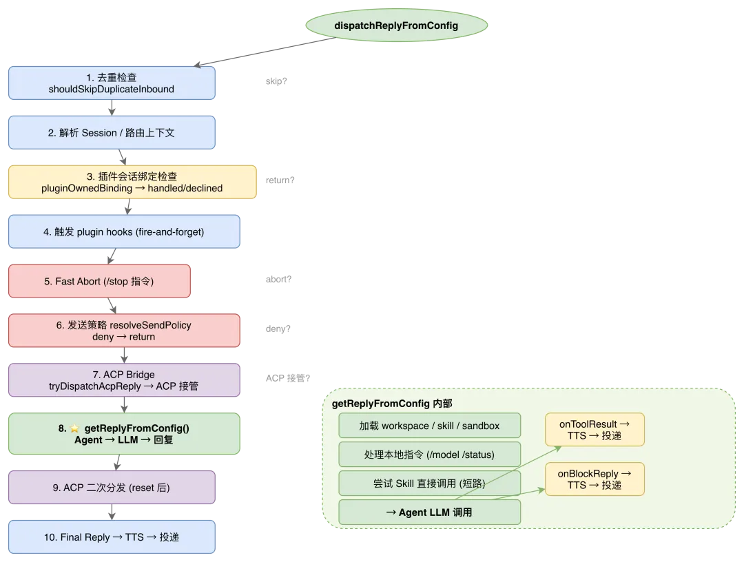 一是流式投递。Agent 的推理过程可能需要数十秒甚至几分钟,如果用户在这期间只看到一个 loading 状态,体验极差。OpenClaw 的 onBlockReply + 出站分块机制让用户实时看到 Agent 的思考进展,这在所有面向用户的 Agent 系统中都值得实现。