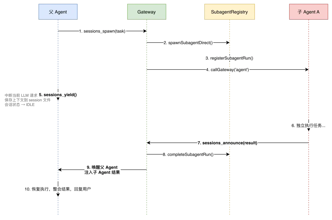 协作式让出完美绕过了这个问题。父 Agent 在自己选择的安全点(通常是工具调用返回后)让出,状态被完整持久化;子 Agent 完成后通过 announce 触发恢复。整个过程只有两个明确的状态——"运行中"和"IDLE"——不存在中间态。