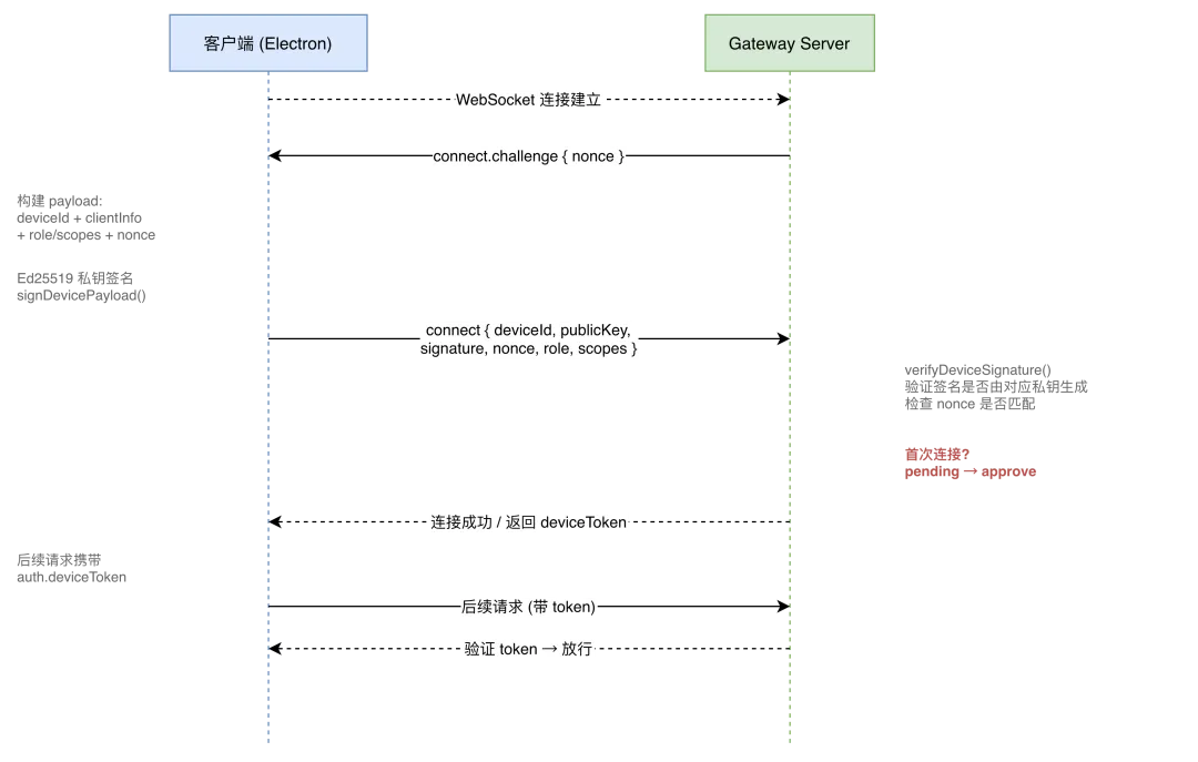 WebSocket 连接建立后,Gateway 发送 connect.challenge(含随机 nonce)。nonce 是一次性的,防止重放攻击。