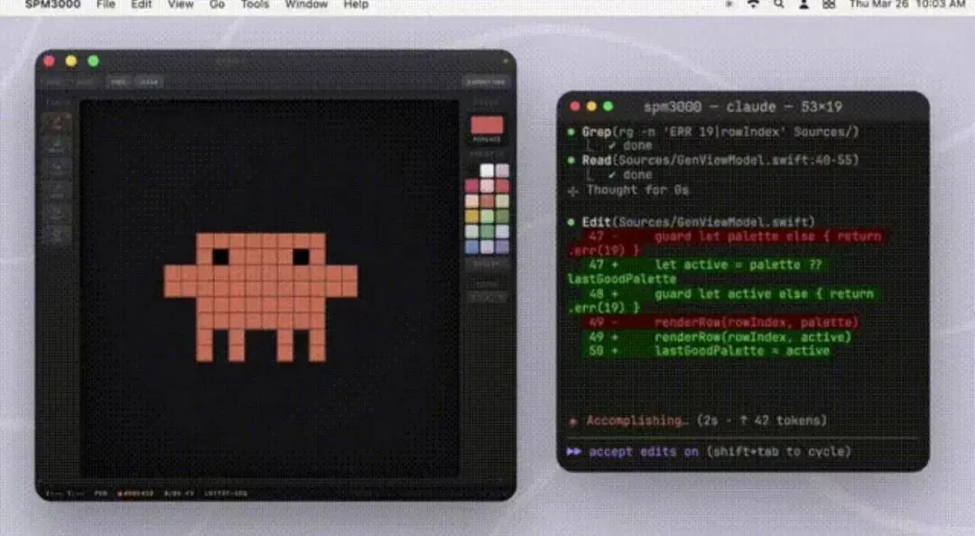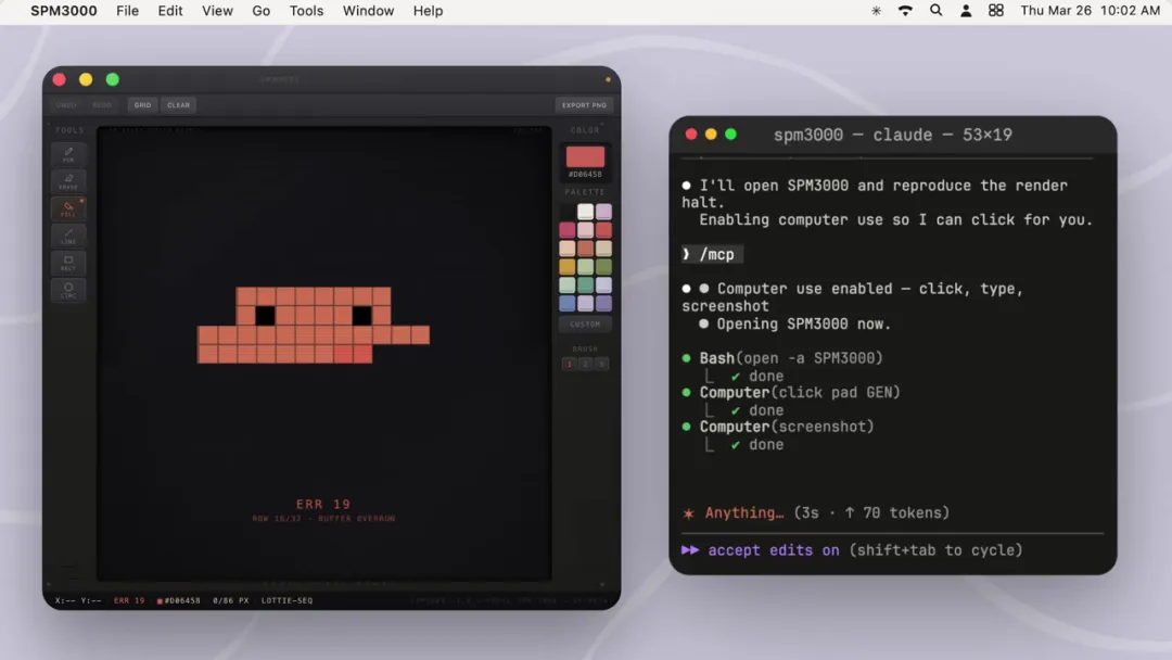 Claude 打开了 SPM3000 应用,点击了 GEN 按钮,屏幕上出现了一个像素画小动物——但渲染到一半就停了。