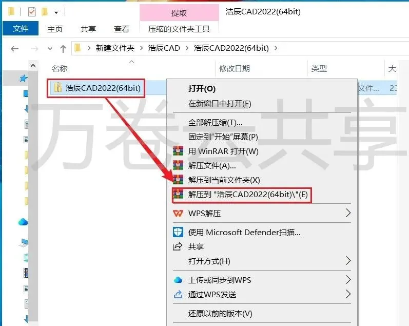 1.鼠标右击→压缩包,选择→解压到 浩辰CAD2022(64bit)