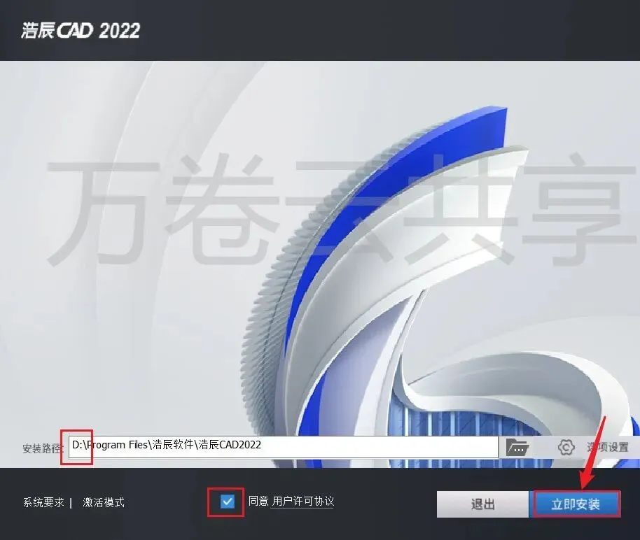 4.①修改路径地址中的第一个字符C可更改安装位置(如:把C改为D软件将安装到D盘)②勾选同意③点击→立即安装