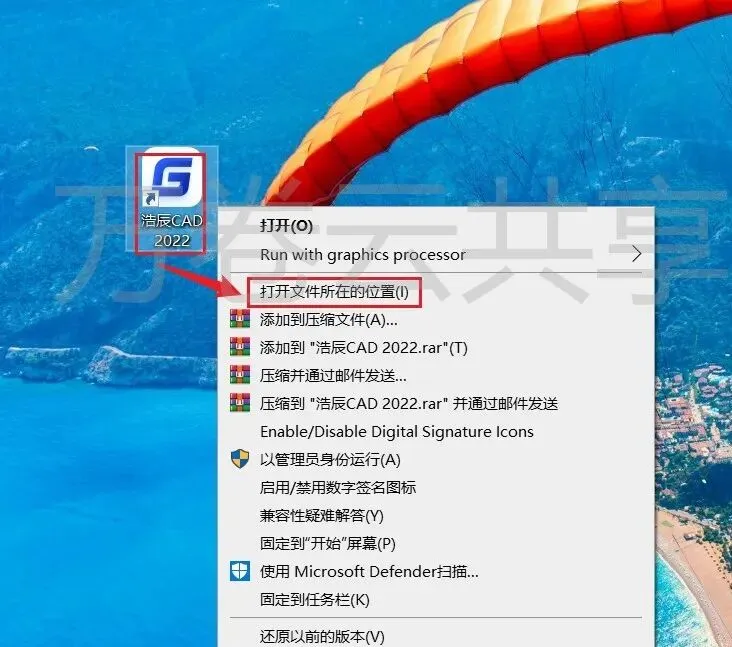 9.鼠标右击→桌面浩辰CAD2022,选择→打开文件所在的位置