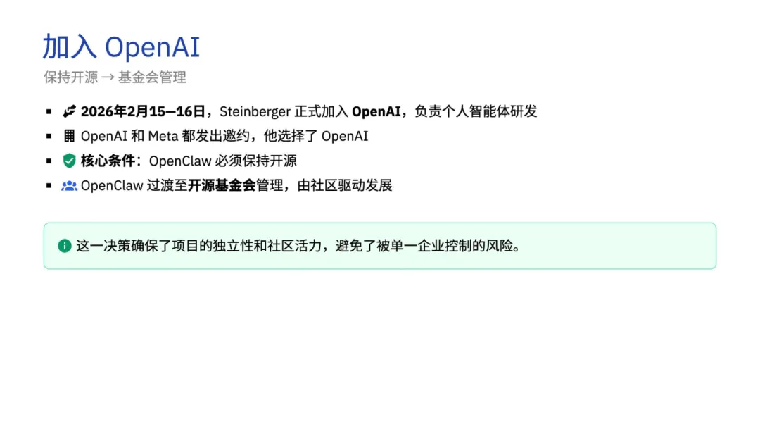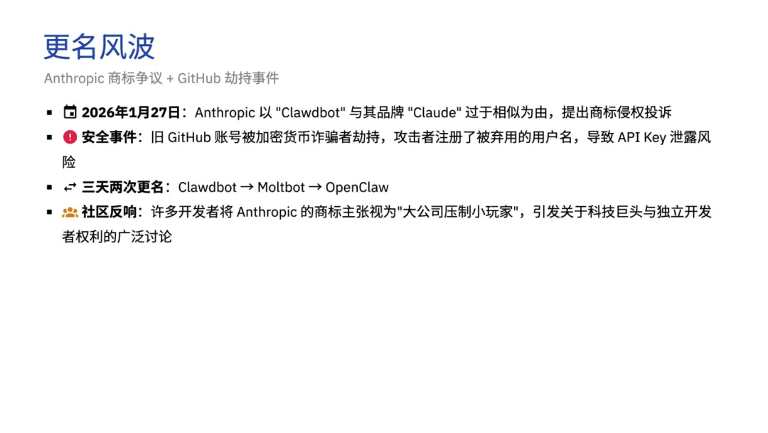 项目创始人 Peter Steinberger 曾出售 PDF 公司获 1 亿欧元,2025 年投身 AI 研发,1 小时完成首个原型。项目历经 WhatsApp Relay、Clawdbot、Moltbot 三次迭代,因 Anthropic 商标投诉与 GitHub 账号劫持,最终定名 OpenClaw。更名事件引爆社区热度,GitHub Stars 从 2 万暴涨至 24.8 万,云用户破 10 万,2026 年 2 月创始人加入 OpenAI,项目保留开源属性并移交基金会管理。