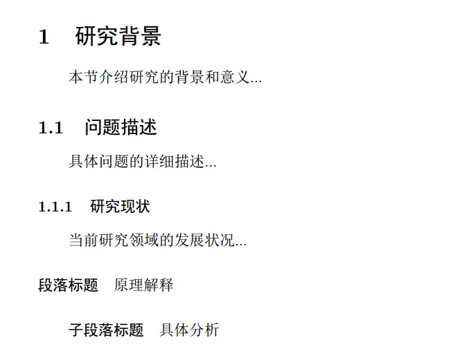 \section{研究背景} % 一级标题本节介绍研究的背景和意义...\subsection{问题描述} % 二级标题具体问题的详细描述...\subsubsection{研究现状} % 三级标题当前研究领域的发展状况...\paragraph{段落标题} % 段落标题原理解释\subparagraph{子段落标题} % 子段落标题具体分析