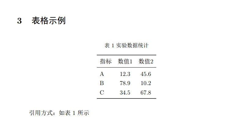 \section{表格示例}\begin{table}[H]\centering\caption{实验数据统计} % 表格标题\label{tab:example} % 方便在正文中引用\begin{tabular}{lcc} % 扩充表格: l 左对齐, c 居中\toprule % 顶部横线指标 & 数值1 & 数值2 \\\midrule % 中间横线A & 12.3 & 45.6 \\B & 78.9 & 10.2 \\C & 34.5 & 67.8 \\\bottomrule % 底部横线\end{tabular}\end{table}引用方式:如表 \ref{tab:example} 所示