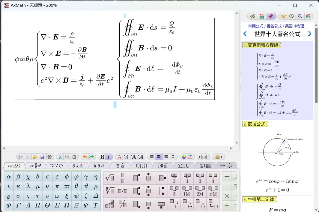 AxMath是一款界面友好的公式编辑器,特别适合习惯使用图形界面的用户。它支持点选输入和LaTeX语法输入两种模式,拥有丰富的符号库和模板,能快速创建复杂公式。