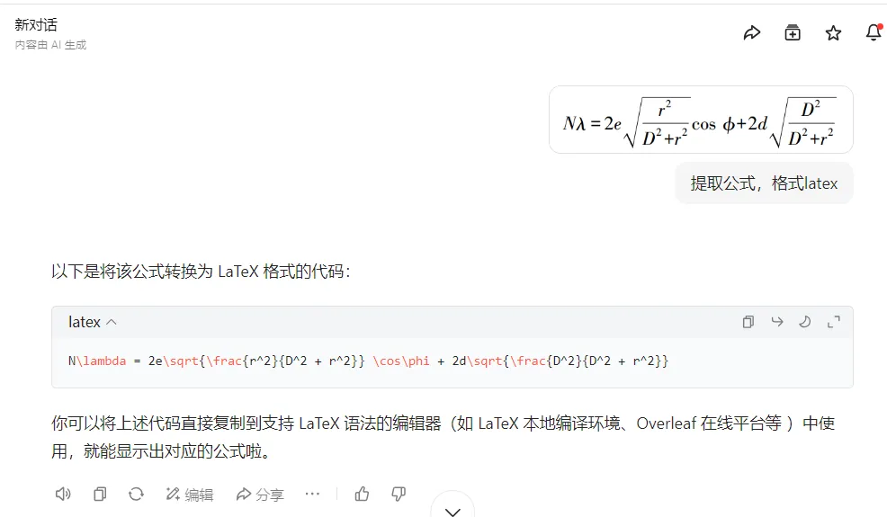 公式提取:将截图发送给AI(如豆包、ChatGPT等),可以快速、免费地获取LaTeX代码,作为SimpleTex的极佳补充。