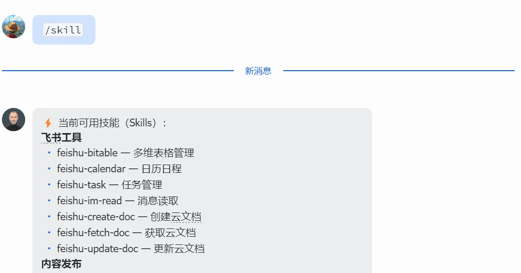/skill <名称> — 按名字运行已安装的技能,不需要写长调用说明,直接触发。