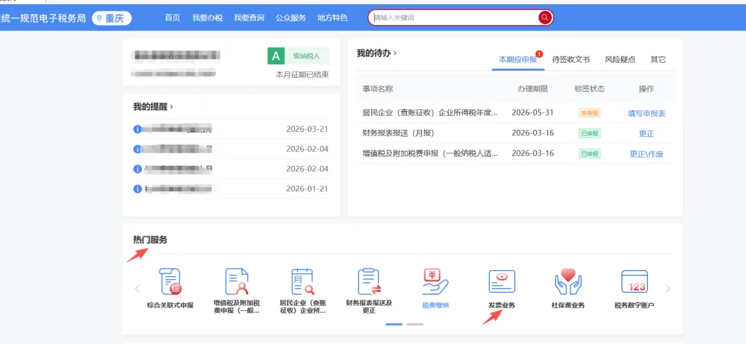 第一步:打开并登录电子税务局,以企业身份登录后的首页中中间部分有个热门服务板块点击发票业务的功能选项进行下一步的操作。