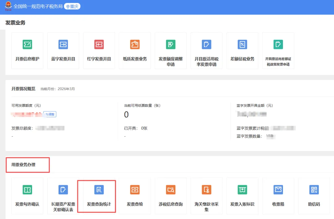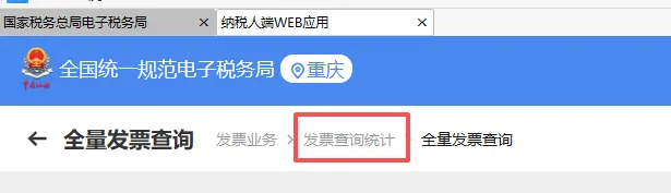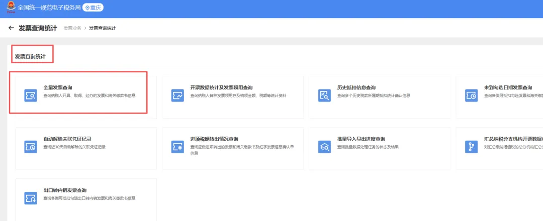 第二步:电子发票服务平台的界面后在这个页面将滚动条拖到下半部分可以看到用票业务办理的功能板块,然后在点击发票查询统计-全量发票查询。如下图所示: