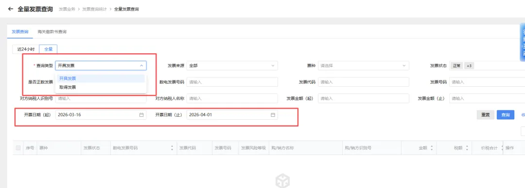 第三步:选择发票类型和发票起止日期,点击查询。如图所示: