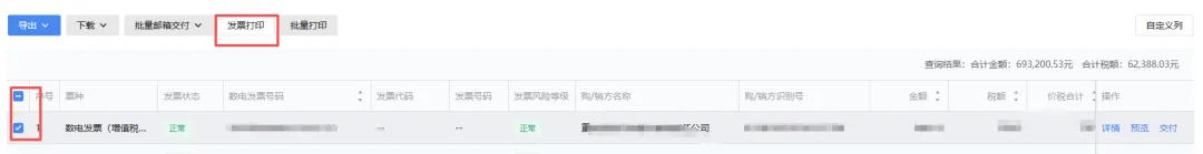 第五步:勾选需要打印的发票,点击发票打印(如果发票张数比较多就选择发票批量打印)。如图所示: