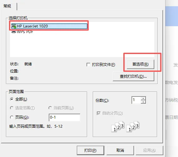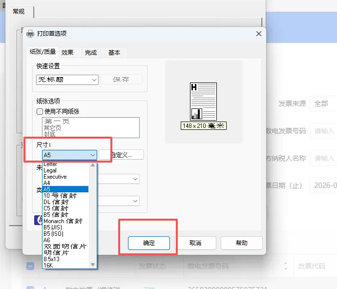 再次点击发票打印,选择打印机—首选项—选择尺寸—确定。如图所示: