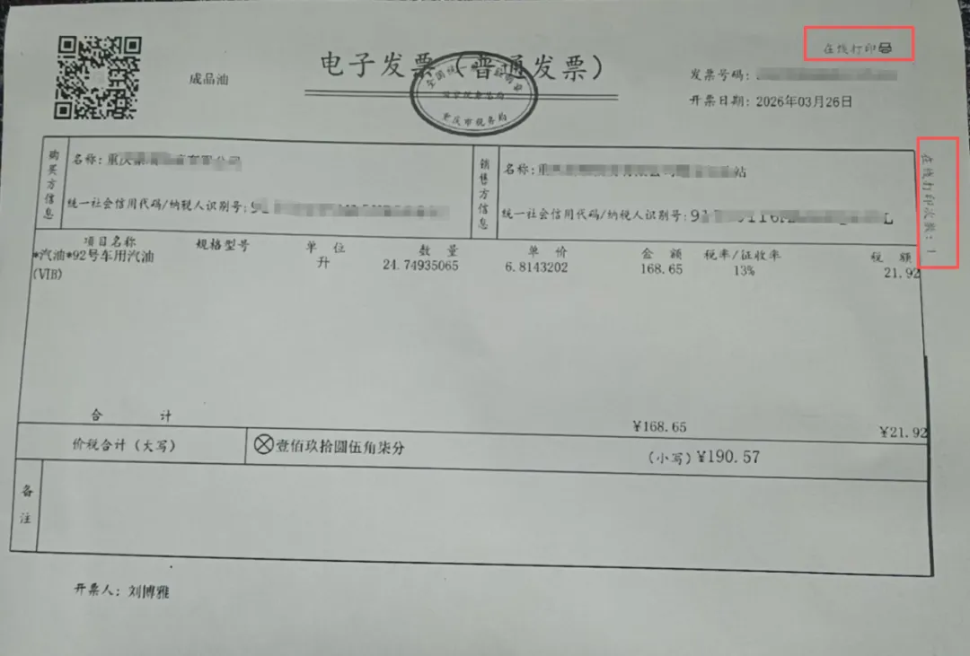 然后将打印机放上合适的纸张,我是选择的A5纸 这样打印出来就不用裁剪了,发票打印就完成了,发票上面有显示在线打印以及在线打印的次数。打印出来的效果是这个样子的。如图所示: