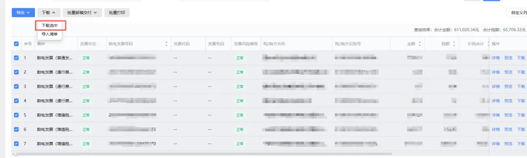 第一步:也是一样以企业身份登录电子税务局中,点击首页中中间部分有个热门服务板块点击发票业务的功能选项,进入到全国统一规范电子税务局-电子发票服务平台的界面后在这个页面将滚动条拖到下半部分可以看到用票业务办理的功能板块,然后在点击发票查询统计-全量发票查询,(前面有操作图片,在这里就不在赘诉)。找到需要打印的发票信息,勾选需要下载的发票,选择下载选中,如图所示:
