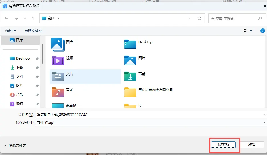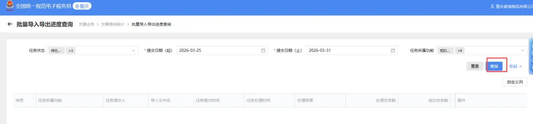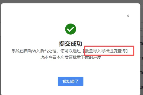 点击确认后系统就会提示下载申请提交成功,我们可以到【批量导入导出进度查询】继续下载我们需要的发票文档