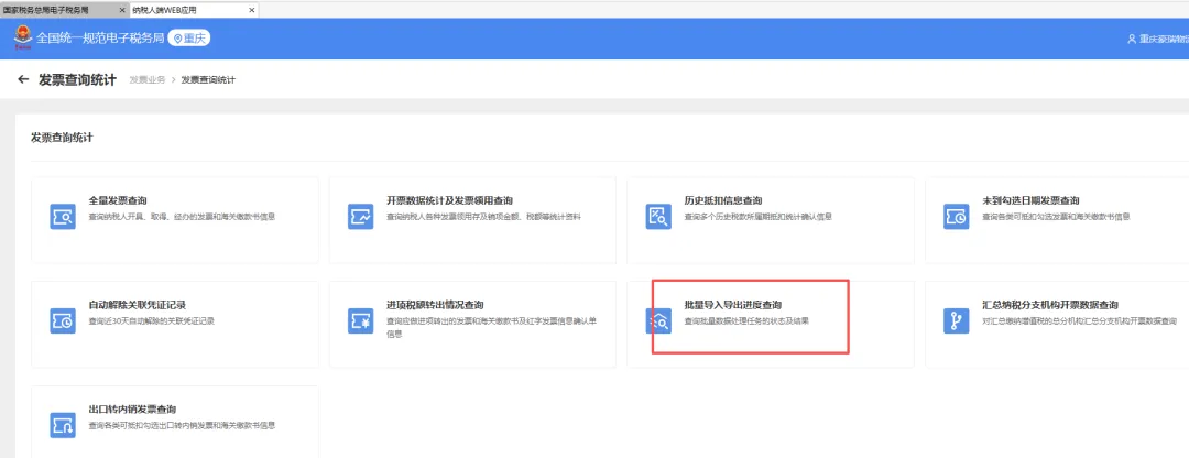 第三步:点击发票查询统计—批量导入导出进度查询。如图所示;
