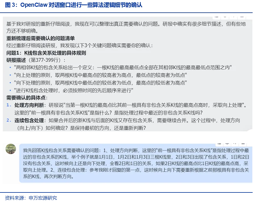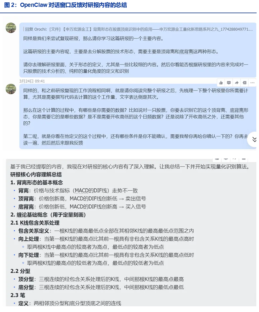 从回复来看,OpenClaw对研报的总结完整、准确,原始研报的背离形态先进行“K线包含关系处理-分型识别-笔识别-背离形态” 的识别流程,OpenClaw整理的流程与研报一致,且对阈值的计算和理解都是正确的。