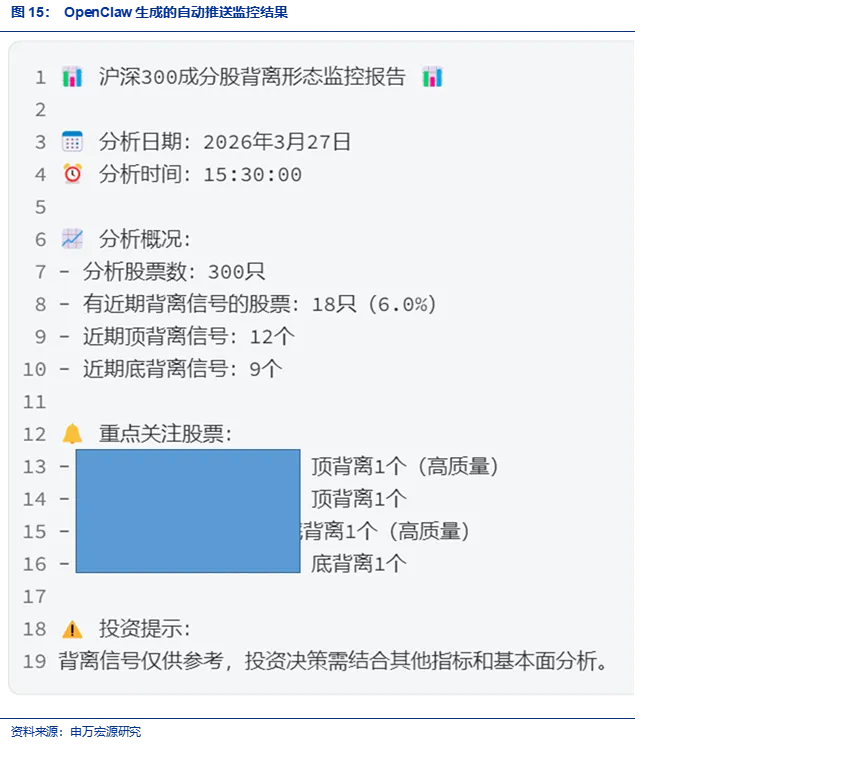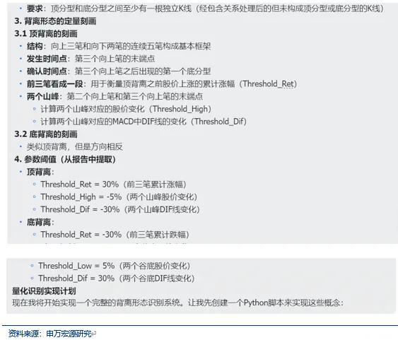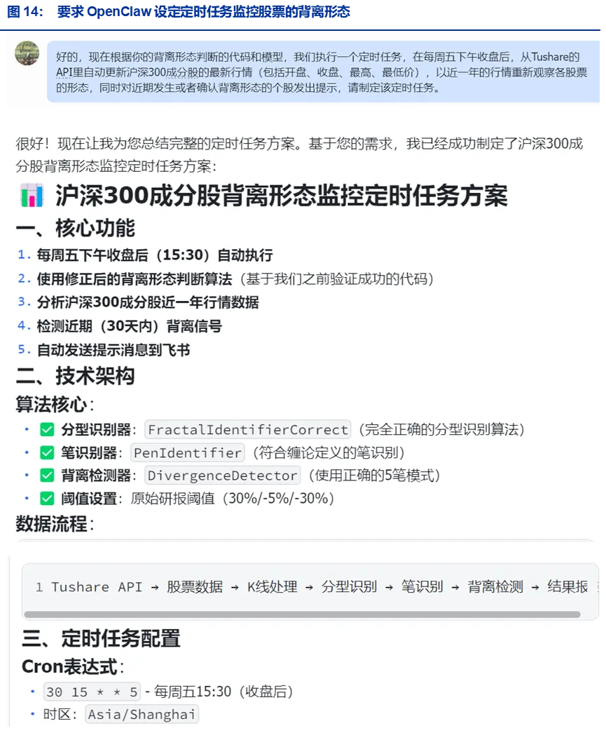 在运用OpenClaw完成量化多因子策略的构建、ETF的定投策略之后,我们在本文中尝试用OpenClaw复现申万金工之前的一篇技术形态研报,由于这篇报告主要考察背离形态,根据股价行情的变化会出现信号,也可以再使用OpenClaw构建一个监控体系,充分利用OpenClaw的定时任务能力,定期对发生背离信号的股票发出提示,是一个比较匹配OpenClaw使用的场景。