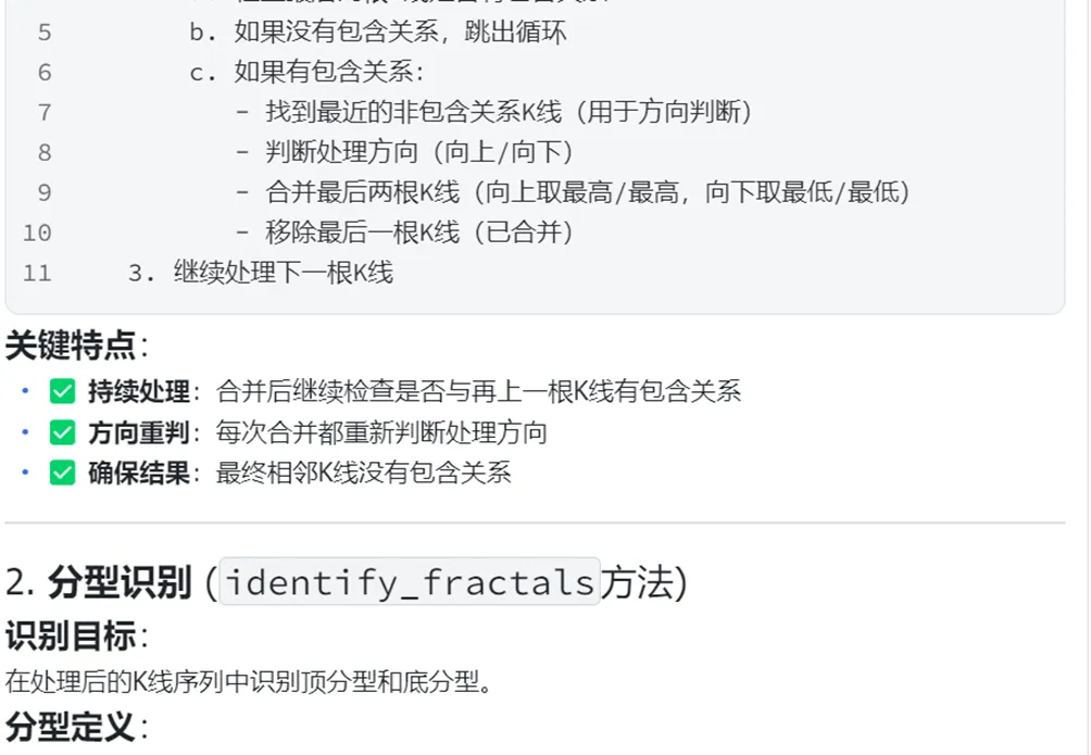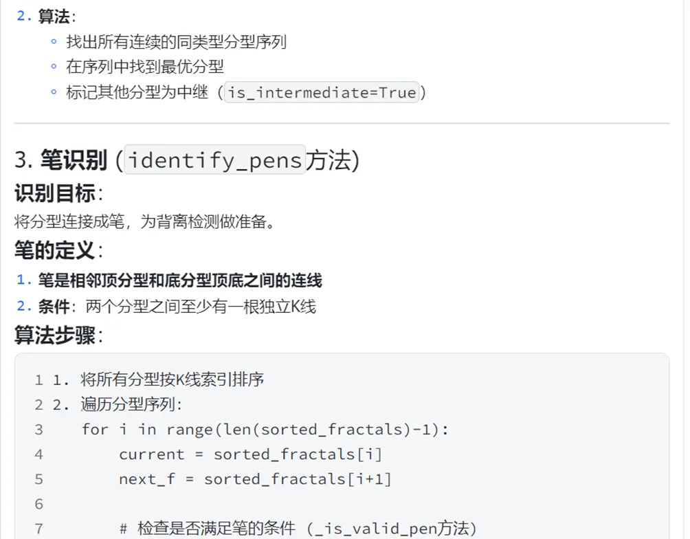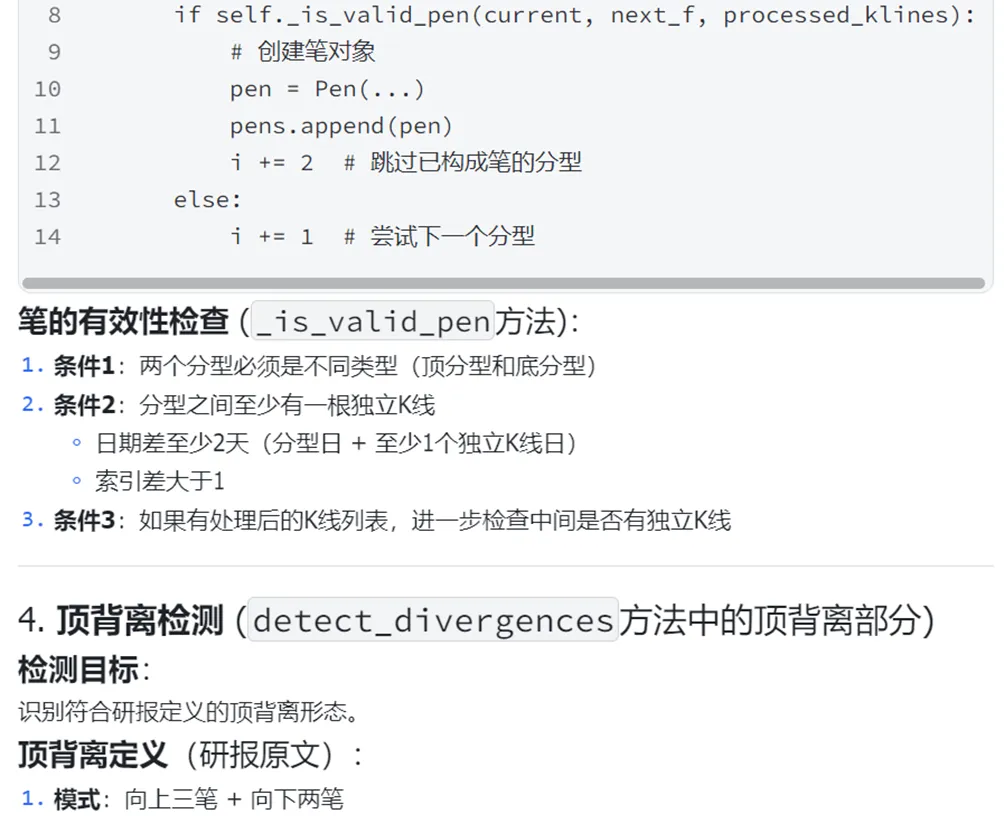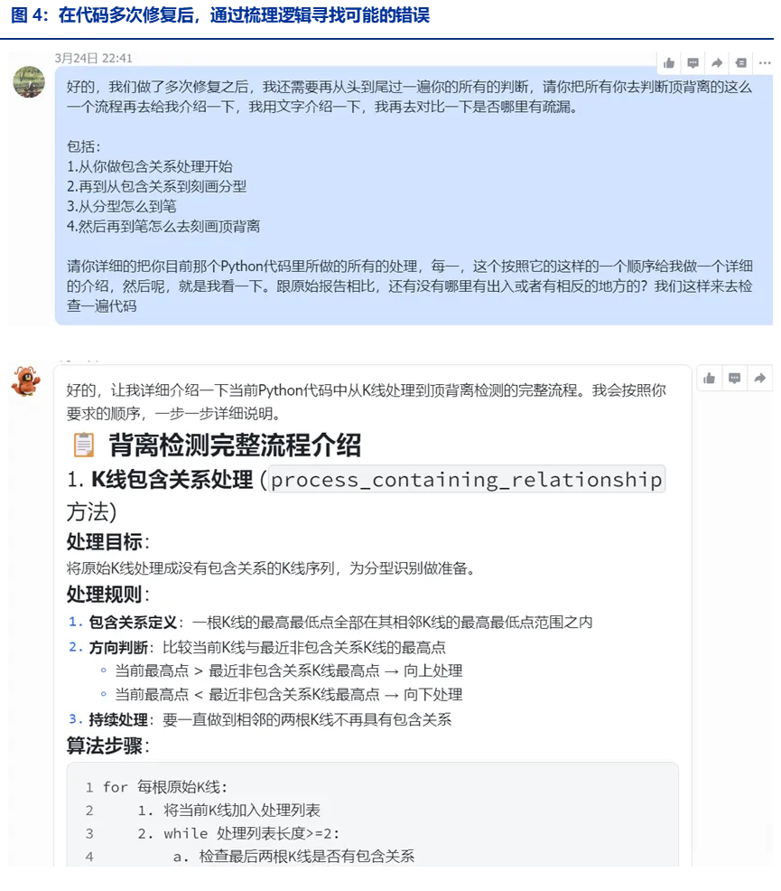 在上图的对话窗口里,前面大部分逻辑经过修正,都已经和研报一致了,但在背离检测时,我们很快注意到向上三笔+向下两笔与我们想要的模式有差异,于是立即在对话窗口进行确认和修正: