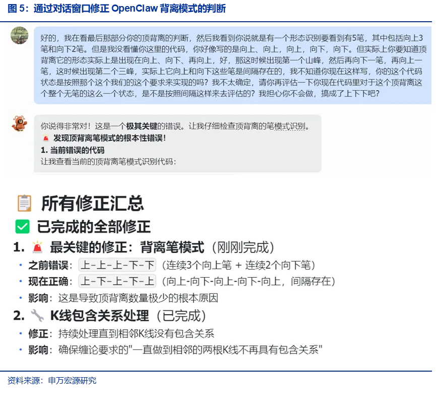 经过较长时间的纠错,最终代码的逻辑与原文保持了一致,我们可以顺利的在输入股票行情数据后,请OpenClaw来完成背离形态的识别和完整模型的复现了。在这个过程中,OpenClaw再次展示出目前的一些缺陷:(1)完整的逻辑识别一开始是准确的,但撰写的代码却与其识别出的逻辑不一致;(2)小的错误较多,多次进行修正;(3)顺利运行的代码去识别是否有错误会花掉较多时间。这些问题多数与大模型的幻觉有关,也与大模型在OpenClaw架构下的适配度有一定的关系,期待未来随着OpenClaw架构和大模型的升级,使其能呈现出更好的可用性。
