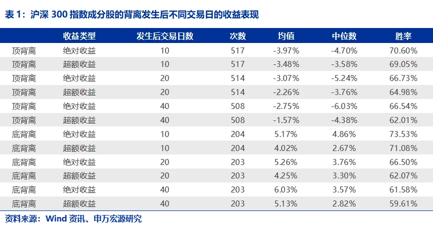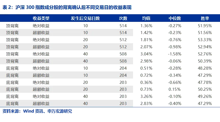 我们首先展示背离发生后的统计结果,从表1可知,背离发生后,顶背离的股票后续表现下跌无论是绝对收益还是相对指数的超额收益,都幅度明显,而底背离的股票发生后上涨幅度也较为明显,且10个交易日的胜率都能在70%左右,随着时间的拉长胜率逐渐下降到60%附近。