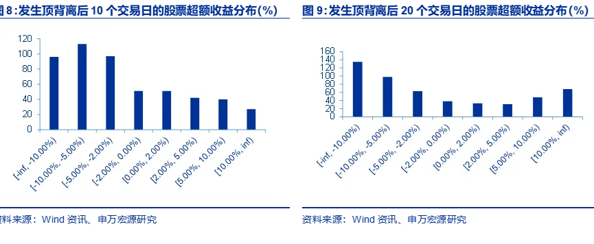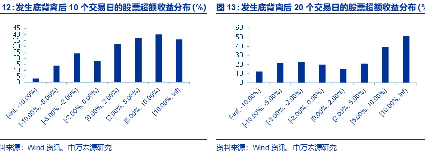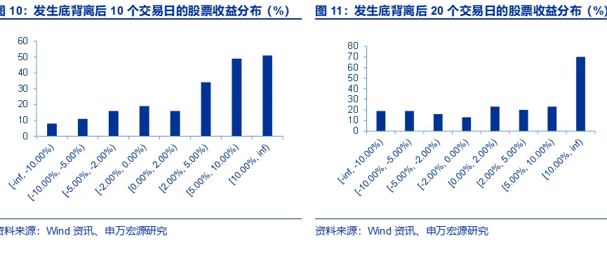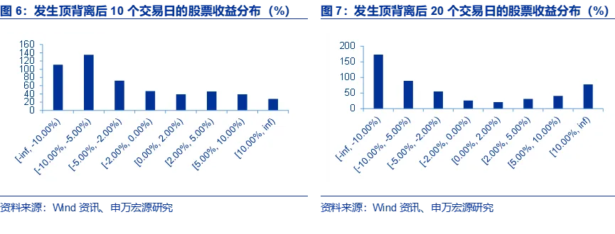 从顶背离来看,收益分布出现了明显的长尾效应:虽然大部分个股倾向于下跌,下跌的分布数量也较为集中,但上涨不同幅度的股票都有分布,也出现了10个交易日后涨幅超过10%的股票,这一点在20个交易日即时间拉长后体现的更加明显,出现了一定的“尾部上翘”的特征,说明确实有部分股票即使在顶背离后出现较大幅度的上涨。顶背离形态存在错过大牛股的可能性,股票从概率上有更高下跌的概率,但也有上涨幅度较多的个股,因此具体还应结合基本面一起分析。