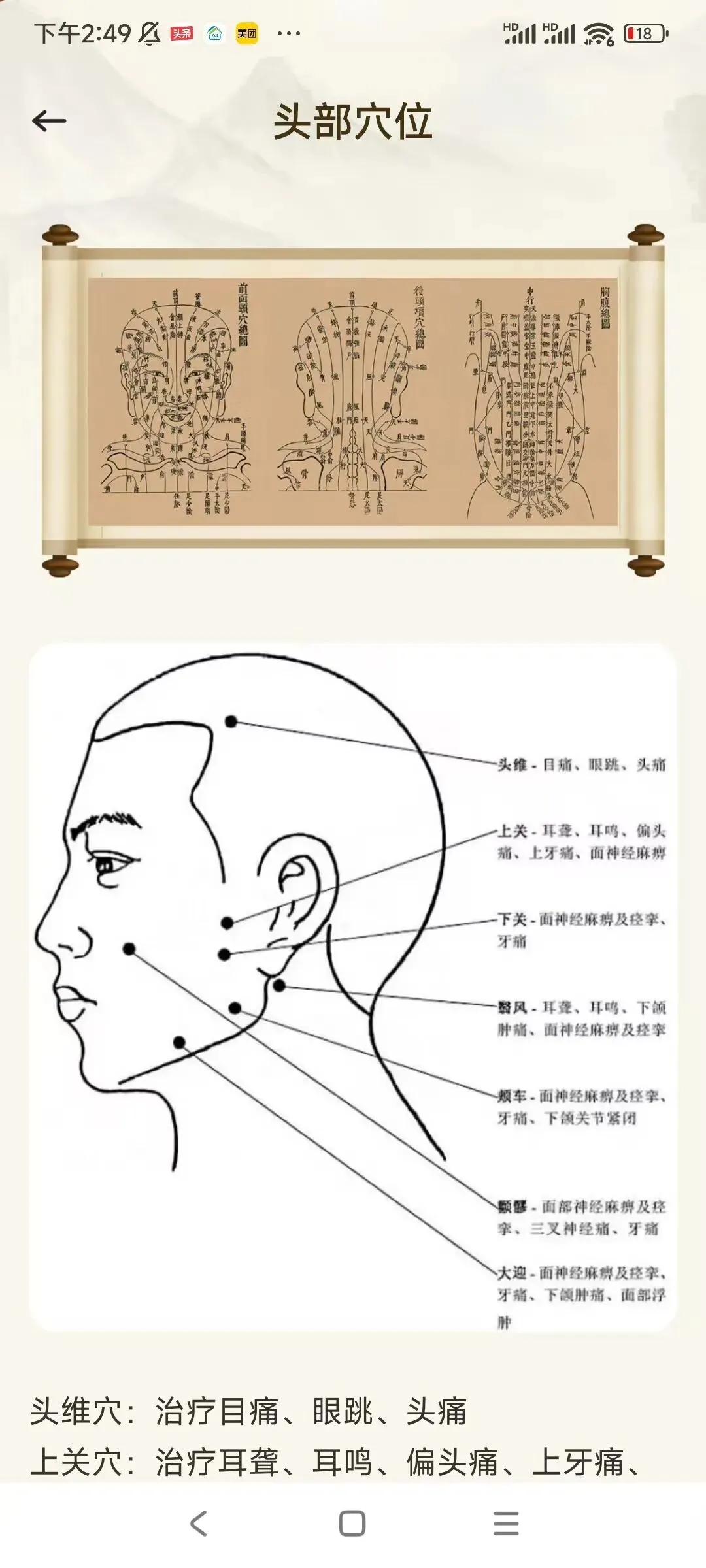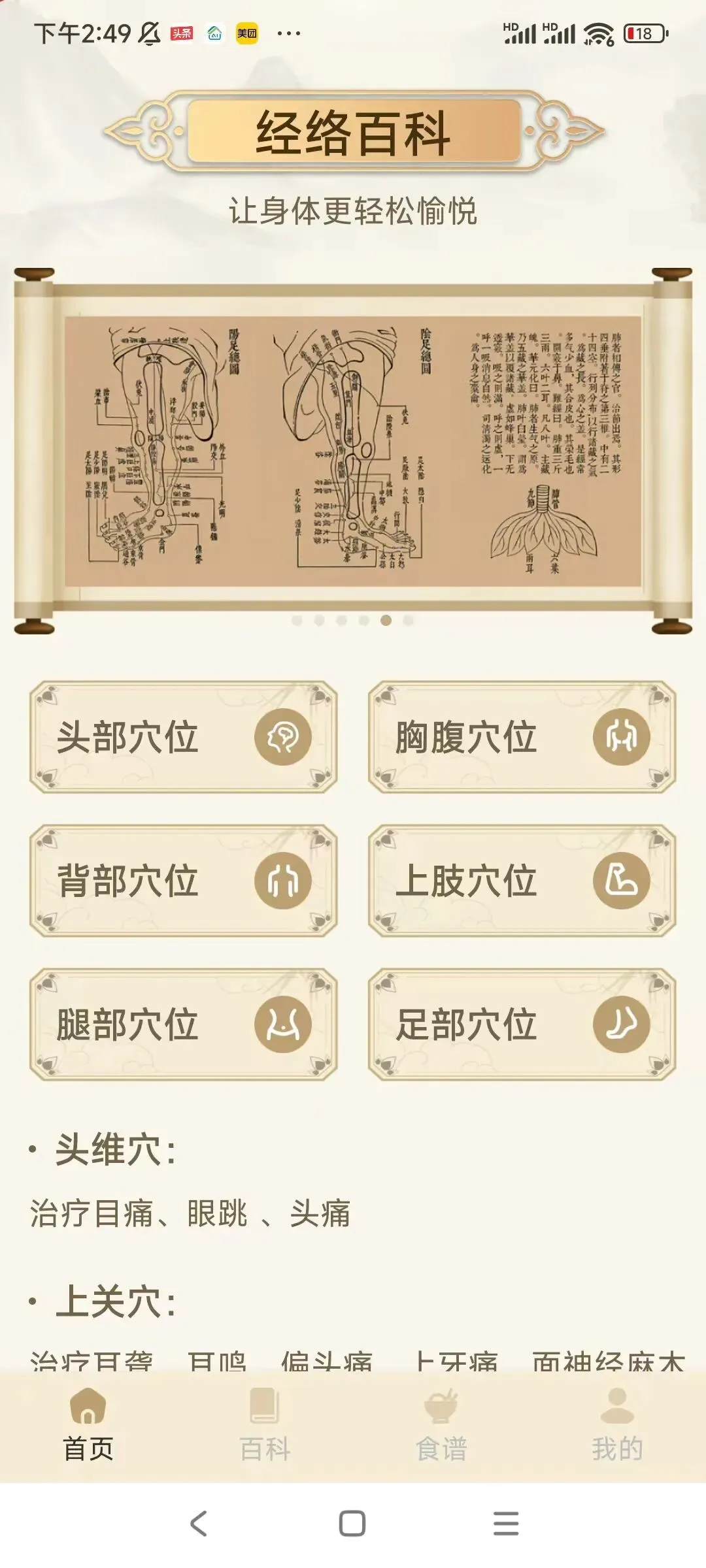 经络百科根据身体位置,把全身穴位分为六大类:头部穴位,胸腹穴位,背部穴位,上肢穴位,腿部穴位,足部穴位。每个穴位都有功能介绍。