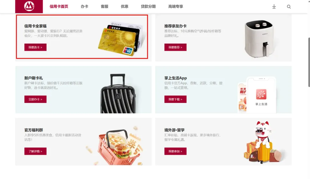 或者是招商银行APP上,在首页搜索“visa”。点击“信用卡全家福”,找到visa全币种国际信用卡,点“立刻申请”。
