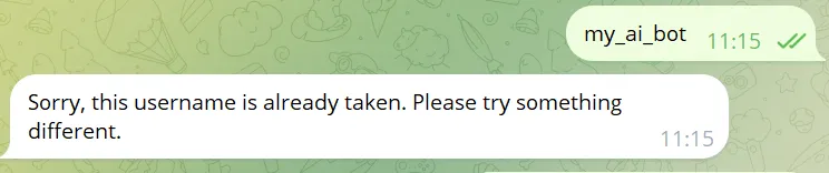 ⚠️注意:如果你发的类似这种“my_ai_bot”,可能已经有人用过了,它会提示你“这个用户名已经被别人注册了/太常见了,请换一个。”