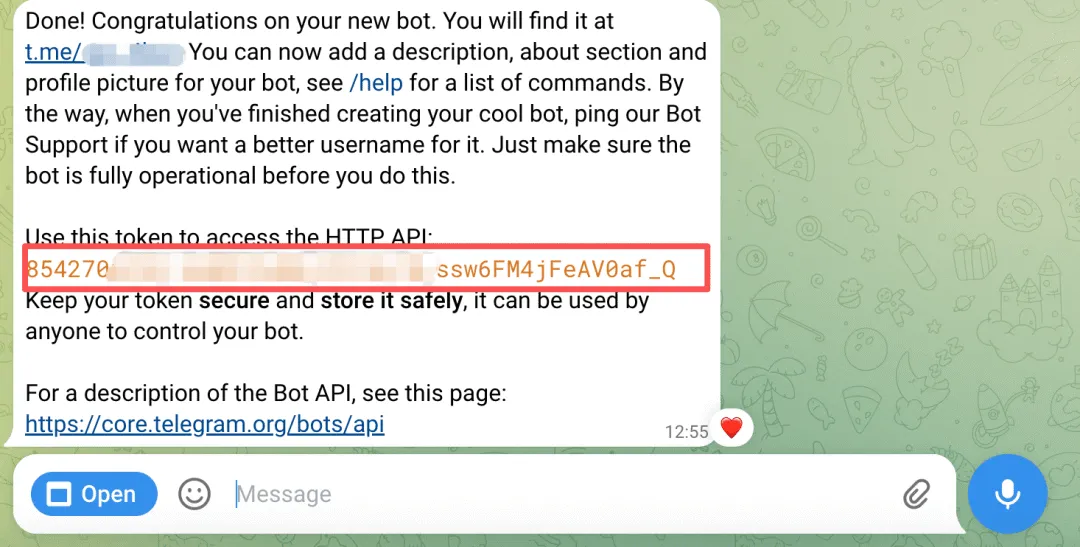BotFather 会给你一个 Bot Token(一串像 123456:ABC-DEF 的字符),保存好它