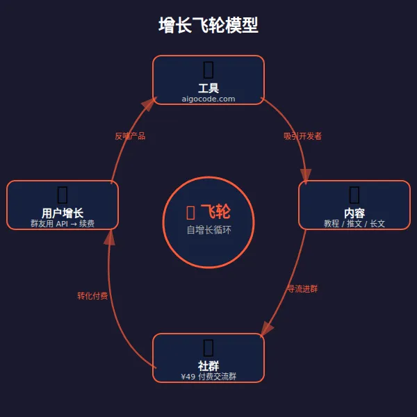 工具(aigocode.com)→ 内容(教程/分享)→ 社群(交流群)→ 更多人用工具