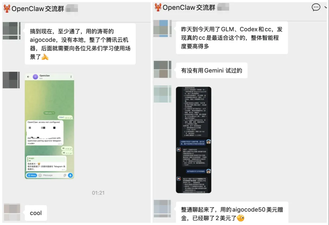 99 元入群,送 $50 aigocode.com 算力额度。群里不卖课,都是实际在用 OpenClaw 的玩家,每天分享使用技巧和踩坑经验,氛围很活跃。
