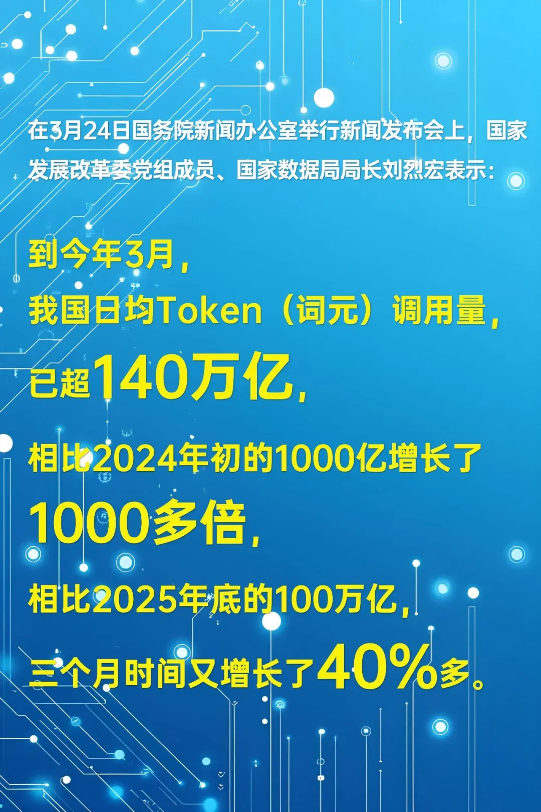 3月份,一组数据悄然刷屏:我国日均token调用量突破140万亿。两年增长了1000倍,三个月又涨了40%。