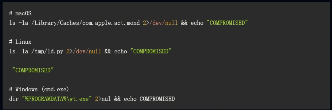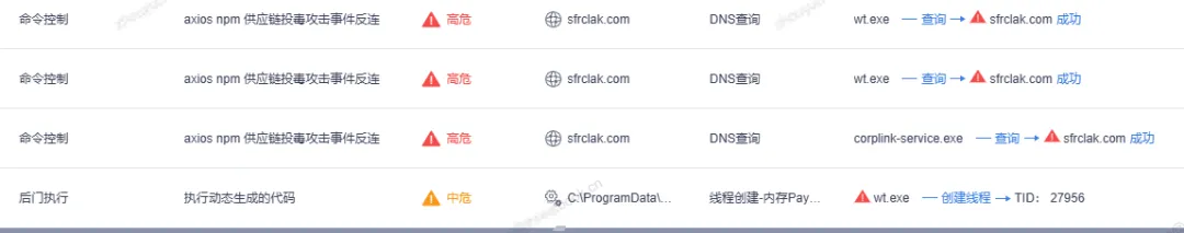 恶意版本1.14.1与0.30.4会自动下载并运行远控木马,影响操作系统包括Windows、Linux及macOS。建议大家立即排查sfrclak.com反连情况(反连即失陷),处置方案详见后文。
