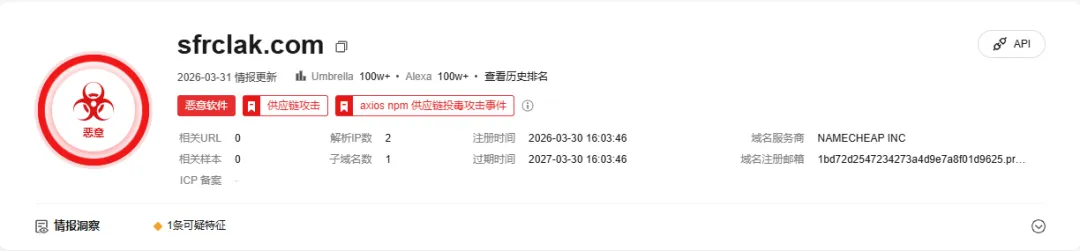 攻击者在3月30日注册了恶意域名:sfrclak.com