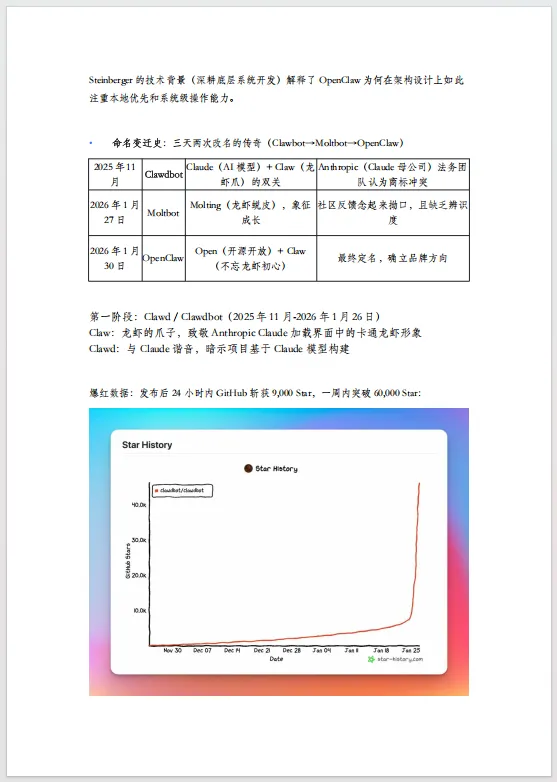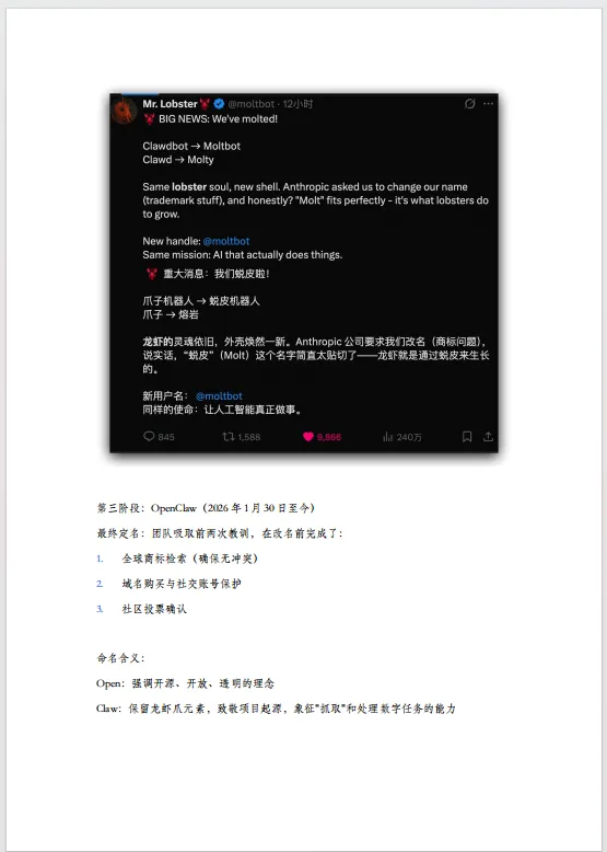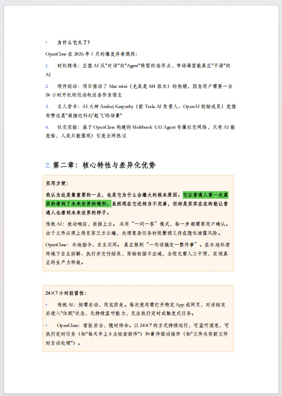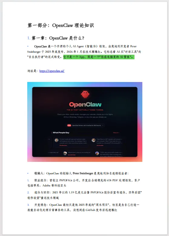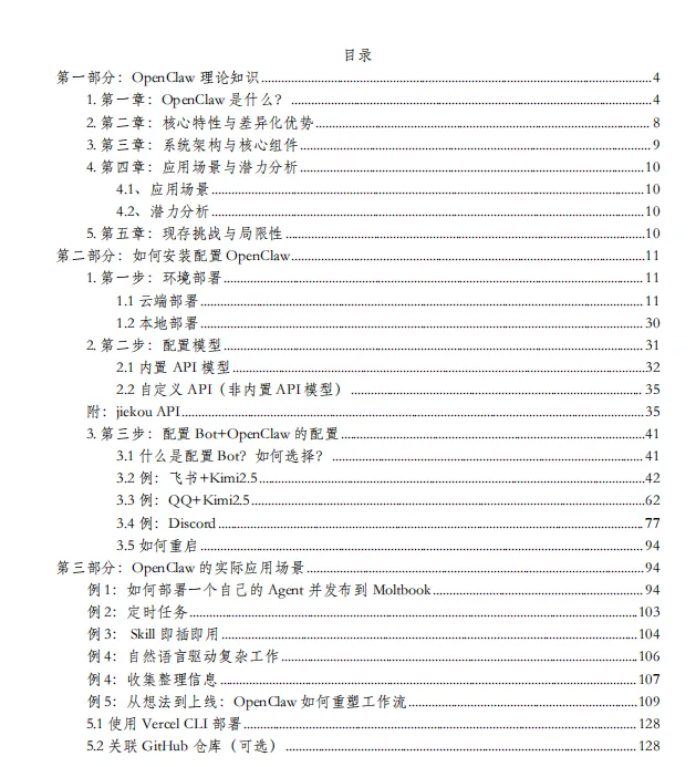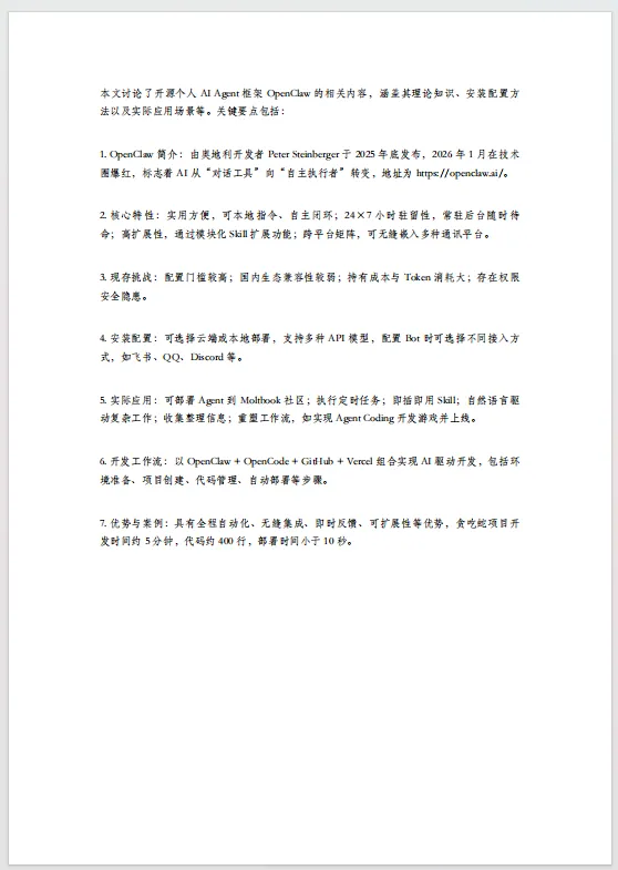 这份《2026年OpenClaw从入门到精通指南》132页系统性地将前沿的AI Agent技术从概念推向了大众可实践的层面,标志着AI应用从“对话与问答”的工具范式,向“自主执行与闭环”的智能体范式实现了关键性的跨越。它不仅仅是一份操作手册,更是一份面向未来的宣言和路线图。指南极大地降低了个人AI Agent的实践门槛。它通过详尽的步骤拆解,将复杂的云端部署、模型配置、平台集成等过程,转化为“有手就行”的可操作流程,使得普通开发者和技术爱好者能够亲手构建并拥有一个24小时在线的“数字分身”。这加速了AI Agent技术从极客圈向更广泛人群的渗透,是技术民主化的重要一步。指南生动展示了AI驱动的自动化工作流的巨大潜力。其核心价值在于“重塑工作流”,例如通过“OpenClaw + OpenCode + GitHub + Vercel”组合实现从自然语言想法到代码生成、版本管理、自动部署上线的全链路自动化。这不仅仅是效率的提升,更是工作模式的根本性变革,预示着未来“Agent Coding”等新范式的兴起,个人生产力将被重新定义。指南揭示了以OpenClaw为代表的“本地优先、数据在内”架构的战略方向。在数据隐私日益受到重视的背景下,这种将敏感数据留在本地、仅将计算任务交由外部模型的模式,为构建私有化、可信的AI生态提供了可行的基石。它回应了市场对数据安全的深层焦虑,指明了AI落地的一条重要路径。指南通过Moltbook社区、Skill即插即用等案例,描绘了一个由AI Agent作为活跃主体的新兴数字社会图景。智能体不仅能完成具体任务,还能社交、创作甚至形成文化现象。这激发了人们对人机协同未来形态的无限想象,其社会实验意义远超技术本身。这份指南是连接AI理论爆发与大规模应用落地的桥梁。它让普通人真切地“看到并触摸到”了未来,加速了AI从辅助工具向自主执行伙伴的范式转变,对推动整个AI Agent生态的成熟与发展具有不可忽视的催化作用。