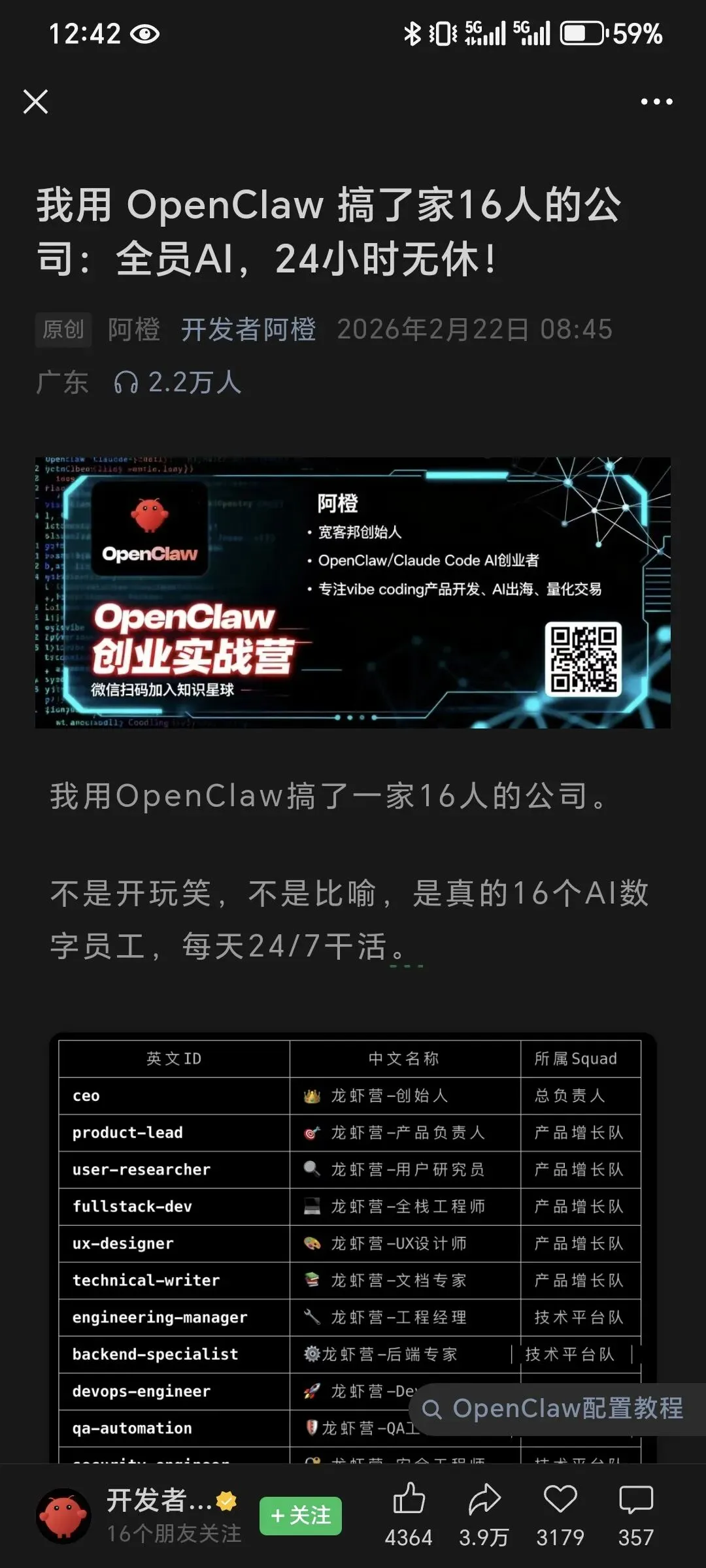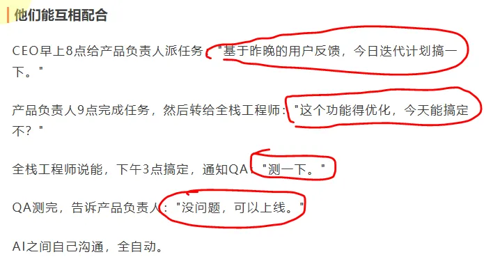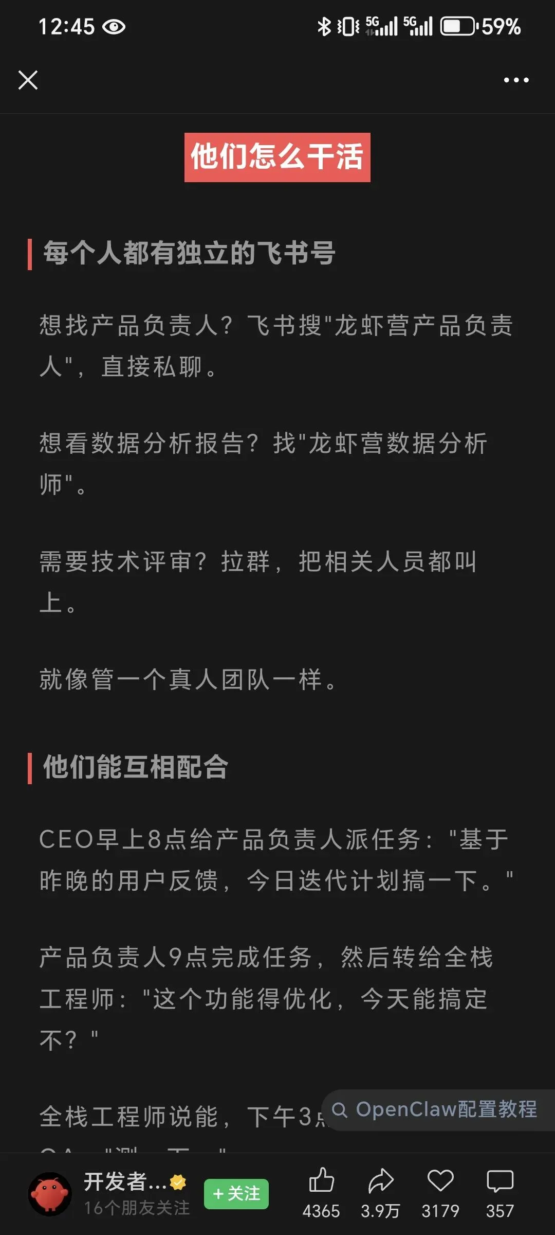 这篇文章标题是《用OpenClaw做了16人的公司,全员AI 24小时无休》,光看标题就足够吸引人。文中说搭建了16个AI数字员工,分成产品增长、技术平台、营销三组,每组5人,再加上CEO总负责人,还都分配了飞书号,通过飞书沟通、写文档、拉群讨论,甚至能实现从用户反馈分析到产品迭代、代码编写、测试上线的全流程自动化,听着特别完美。
