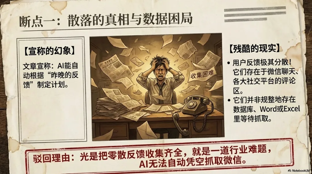 就算反馈收集好了,AI要结合产品做出合理的优化计划,还需要对产品有精准、全面的描述,尤其是线下产品,这部分的前期准备工作本身就是行业难题,而作者却把这一切说得轻而易举,完全忽略了背后的脏活累活。