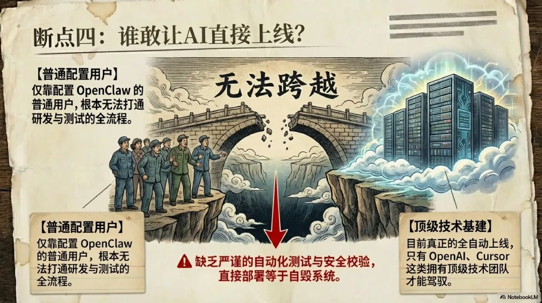 更不用说自动化上线这一步,谁敢直接让AI优化后的代码上线?就算AI完成了测试,研发和测试的全流程打通,目前也只有OpenAI、Cursor这类顶级技术团队能做到,普通用户靠配置OpenClaw根本实现不了。