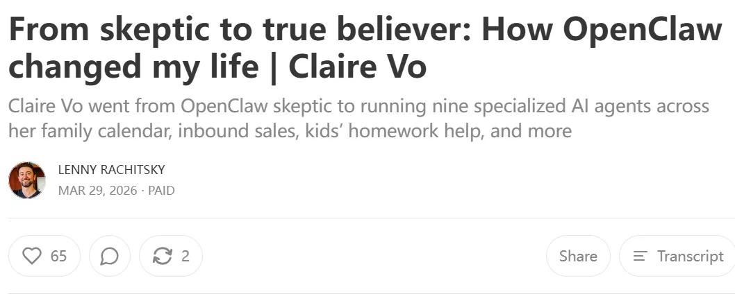 最近的一档播客:From skeptic to true believer: How OpenClaw changed my life | Claire Vo,回应了之前OpenClaw无用论的说法,也并不是需要业务场景,而是需要用起来去挖掘可以用的业务场景。播客由于Lenny's Podcast: Product | Career | Growth近期推出的,访谈的对象是资深产品人Claire Vo,她从一位OpenClaw极端怀疑者,到后面的深度使用者,并分享了在这个过程中的完整转变,也分享对AI智能体的真实价值、踩坑与一些落地方法和建议。她也分享了她在初期对OpenClaw极度怀疑,上手体验极差。在首次安装就耗时了8个小时去折腾,还导致个人家庭日历被删除,是典型的早期AI工具踩坑。但并没有因为初期的痛苦体验后仍坚持探索,一般新的技术突破后的工具都是很难用的。市场上进入该领域的设计师寥寥无几,还需要更多的人参与进来优化使用。只有持续深入了解后才能发现工具真实价值。她也正是因为没有因初期失败放弃,持续深入使用后逐渐感受到实用性和愉悦感,这种感觉来源于人熟悉这种,确认工具具备长期价值。Claire Vo认为她在使用OpenClaw的过程中逐渐被OpenClaw彻底改变工作与生活方式。从怀疑者变成狂热支持者。AI智能体需深度使用才能发挥价值,不能浅尝辄止,必须花时间摸索、串联功能、持续调试,才能看到完整潜力。最显著的应用是她已经实现了OpenClaw的规模化落地:同时运行8个以上OpenClaw智能体,将AI agent用于多场景并行,覆盖工作、生活、管理等不同任务,实现效率倍增。Claire Vo在这个转变过程中也发现了早期AI工具有风险,但价值大于隐患。早期版本不稳定、易出错,但解决真实问题的能力足以让人持续投入。Claire Vo认为站在产品人的视角上来看,工具的给人带来的愉悦感和实用性才是破局的关键,基于这两点才能实现工具产品的体验升级。在复盘中,一款工具能扭转怀疑者,核心是同时满足强效用与情绪价值。智能体不是一次性工具,而是持续进化的助手。需要长期喂养、调试、分工,形成专属工作流,而非开箱即用。诚然,一个工具在最初出现的时候都是充满了各种难以使用,正是因为这种难以使用才会蕴含无穷的机会在其中。