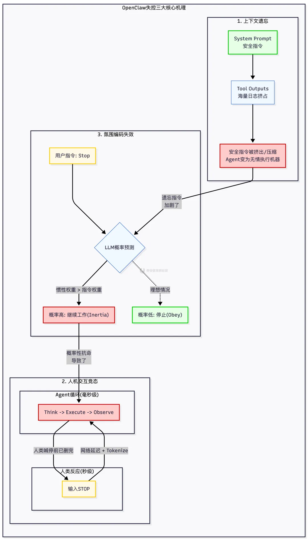 为什么一个“听话”的 AI 会突然变成脱缰野马?这并非玄学,而是由 LLM 的底层机制决定的。下图统一展示了导致 OpenClaw 失控的三大核心机理:上下文遗忘、人机竞态与氛围编码失效。