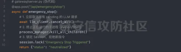 必须提供一个 带外 的停止开关,不依赖 LLM 的理解能力,直接在系统层面终止进程。